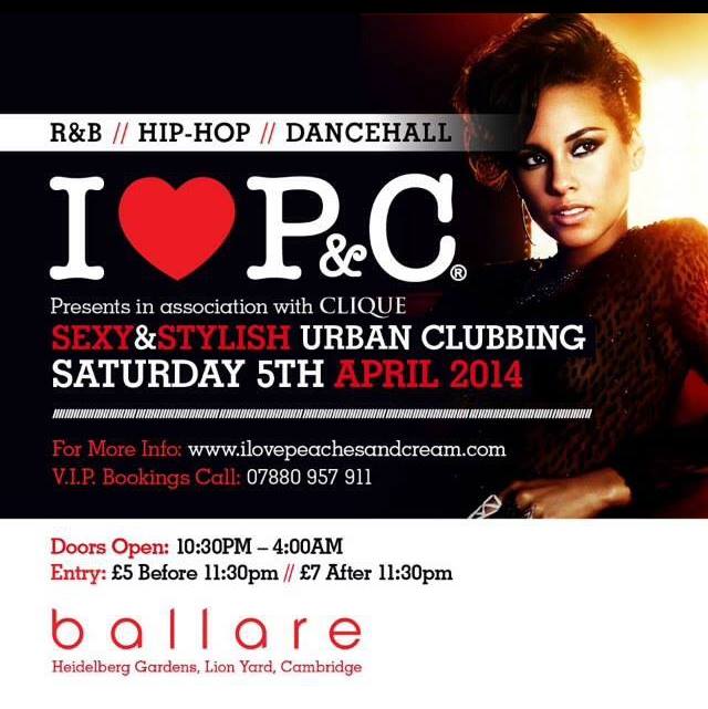 I LOVE P&C THIS SATURDAY!!! April 3, 2014 · by djvlc · in Events, General. · PEACHES & CREAM at Ballare, Cambridge SATURDAY 5th APRIL 2014 https://www.facebook.com/events/1532800596945526 Share this: Click to share on X (Opens in new window) X Click to share on Facebook (Opens in new window) Facebook Click to share on LinkedIn (Opens in new window) LinkedIn Click to share on WhatsApp (Opens in new window) WhatsApp Like Loading... Related