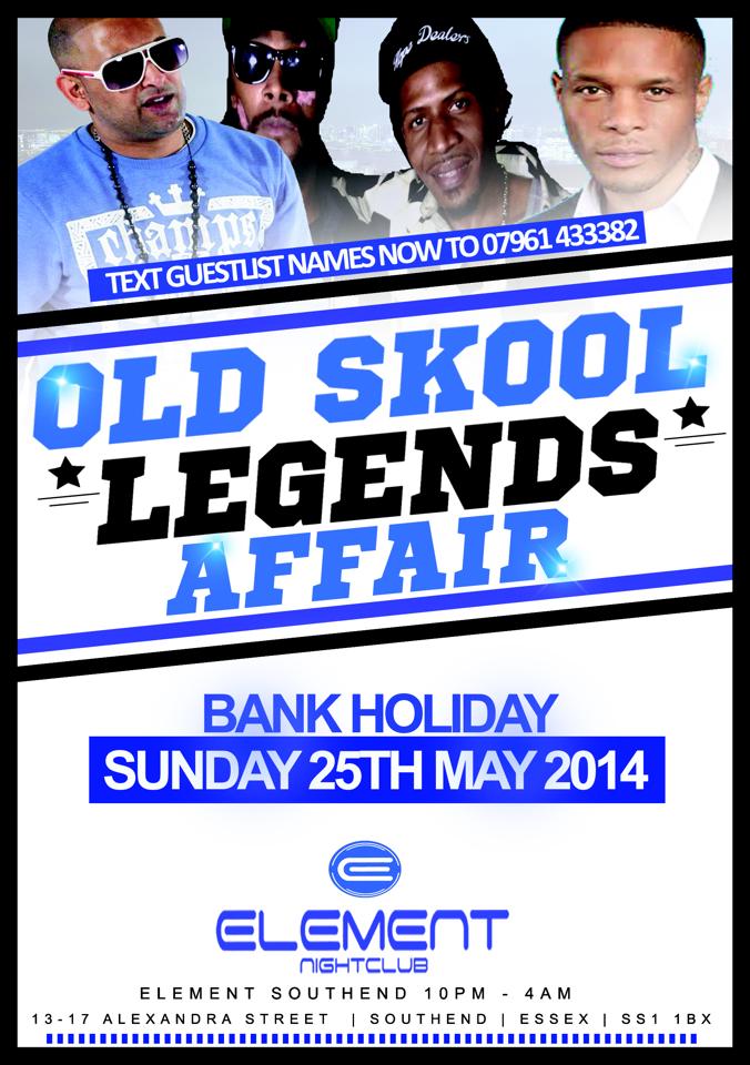 OLD SKOOL LEGENDS AFFAIR May 21, 2014 · by djvlc · in Events, General. · OLD SKOOL LEGENDS AFFAIR [BANK HOLIDAY] at Element Nightclub, Southend SUNDAY 25th MAY 2014 https://www.facebook.com/events/660143694040695 Share this: Click to share on X (Opens in new window) X Click to share on Facebook (Opens in new window) Facebook Click to share on LinkedIn (Opens in new window) LinkedIn Click to share on WhatsApp (Opens in new window) WhatsApp Like Loading... Related