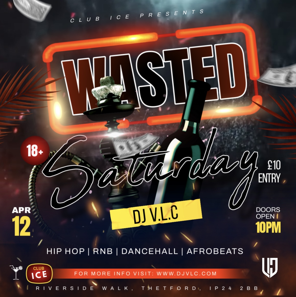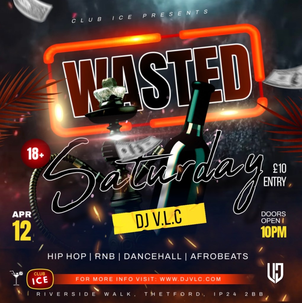 Let’s get WASTED!!! March 31, 2025 · by djvlc · in Events, General. · A NEW event coming to Ice Nightclub in Thetford. with DJ V.L.C playing the Best in Old and New Skool Hip Hop, RnB, Dancehall and Afrobeats. Saturday April 12th 2025 Come through and drink up! Thank you for reading and we look forward to seeing you there. DJ V.L.C Share this: Click to share on X (Opens in new window) X Click to share on Facebook (Opens in new window) Facebook Click to share on LinkedIn (Opens in new window) LinkedIn Click to share on WhatsApp (Opens in new window) WhatsApp Like Loading... Related