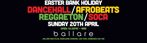 EASTER BANK HOLIDAY [Dancehall, Afrobeats, Regaeton, Soca] SUNDAY 20th APRIL Ballare Nightclub, Cambridge https://www.facebook.com/events/136017013238490/