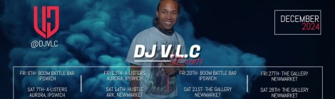 In December 2024, DJ V.L.C will perform at various venues, including Boom Battle Bar and The Gallery in Newmarket and Ipswich, playing Hip Hop, RnB, Dancehall, and Afrobeats. Notable events include the NYE Party 2025 on December 31st. Tickets are available through a provided link.